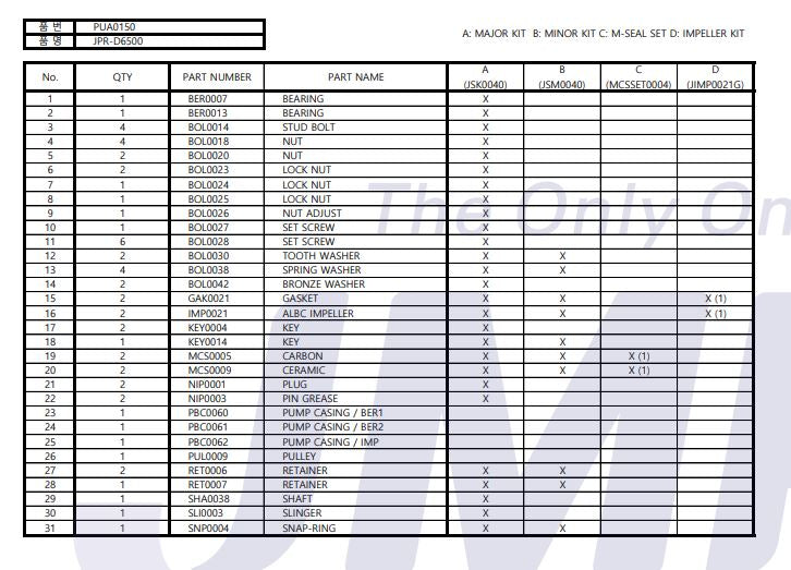 Service Kit (Minor) Seawater Pump JMP JPR-D6500 (D7063), D6505 (D7007)